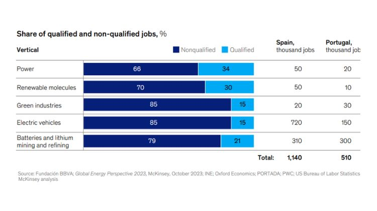 En el Informe se estima que estos sectores pueden llegar a representar entre un mínimo del 10% y un máximo del 20% (una horquilla demasiado amplia para dar la debida fiabilidad) del PIB conjunto de España y Portugal para finales de la década. Los principales motores de esa creación de empleo serían la electrificación de la economía (la incertidumbre que crea el apagón es notable), abarcando desde la expansión de las energías renovables hasta el total despliegue de redes eléctricas inteligentes, sistemas de almacenamiento de energía y vehículos eléctricos. El hidrógeno verde también desempeñará un papel clave en la generación de empleo, especialmente en sectores industriales intensivos en energía como la siderurgia, los productos químicos y los fertilizantes. Un fuerte potencial de empleabilidad se atribuye también al sector de baterías y almacenamiento de energía, impulsado por el auge de los vehículos eléctricos que, sin embargo, de nuevo, conocen hoy en Europa un marcado estancamiento y una elevada incertidumbre, lo que ayuda a ver en ese exceso de confianza en la capacidad creadora de empleo un cierto efecto de “cuento de lechera”.